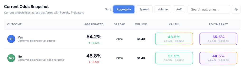 Volume and liquidity in prediction markets tracking whether the California wealth tax will pass remain thin. Low liquidity reflects both caution and uncertainty rather than a clear directional view.