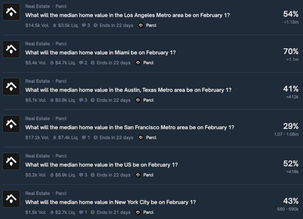 Earlier this week, Polymarket announced a partnership with Parcl, a DeFi protocol focused on real-time real estate price exposure. The integration allows traders on Polymarket’s global platform to take positions on median home price movements in major U.S. cities, including San Francisco, Los Angeles, New York, Miami, and Austin. Note: These real estate markets are not yet available on Polymarket U.S.