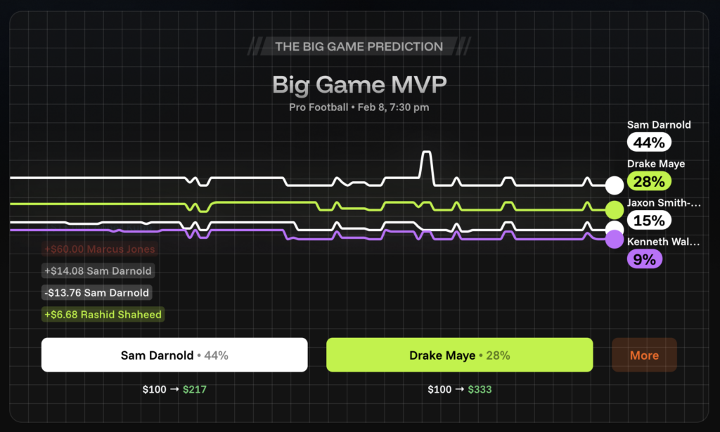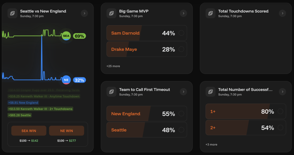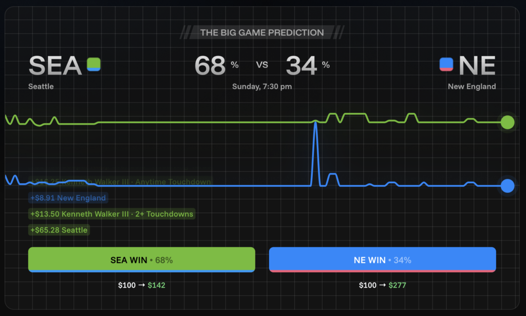 Market Display: Prices are shown as percentages with immediate payout calculations. A Seattle win at 68% displays “$100 → $142” directly on the card, removing mental math from the trading experience.