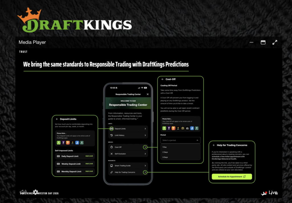 DraftKings also emphasized that its responsible gaming framework will extend fully to DraftKings Predictions through what it calls a Responsible Trading Center. The company said customers trading on DraftKings Predictions will have access to deposit limits, cool-off periods, self-exclusion tools, and educational resources similar to those available across its sportsbook and casino products.