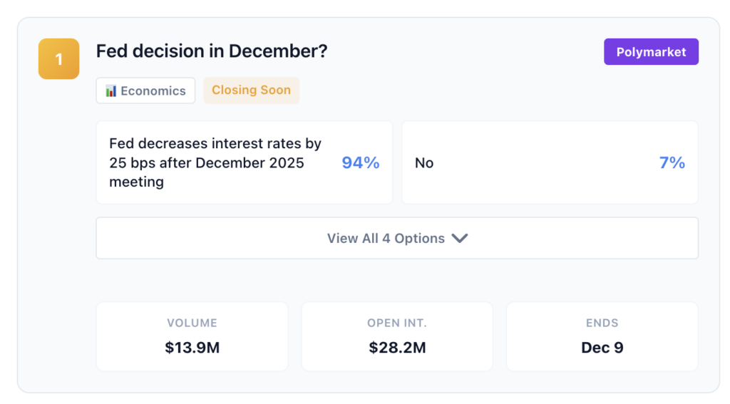 Prediction markets show a 94% probability the Federal Reserve will cut interest rates on Wednesday. In the past 24 hours alone, $14 million has traded on the December decision across the two major prediction markets, with $310 million in all-time volume.