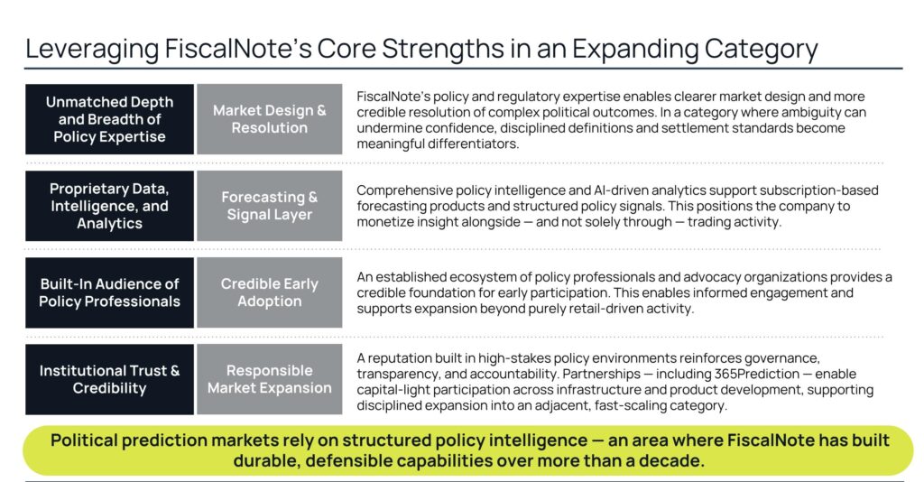 FiscalNote’s approach fits squarely within that emerging use case. By positioning prediction market data as an extension of its policy intelligence platform rather than a standalone trading product, the company is effectively testing whether those market forecasts can become another layer of institutional policy analysis.