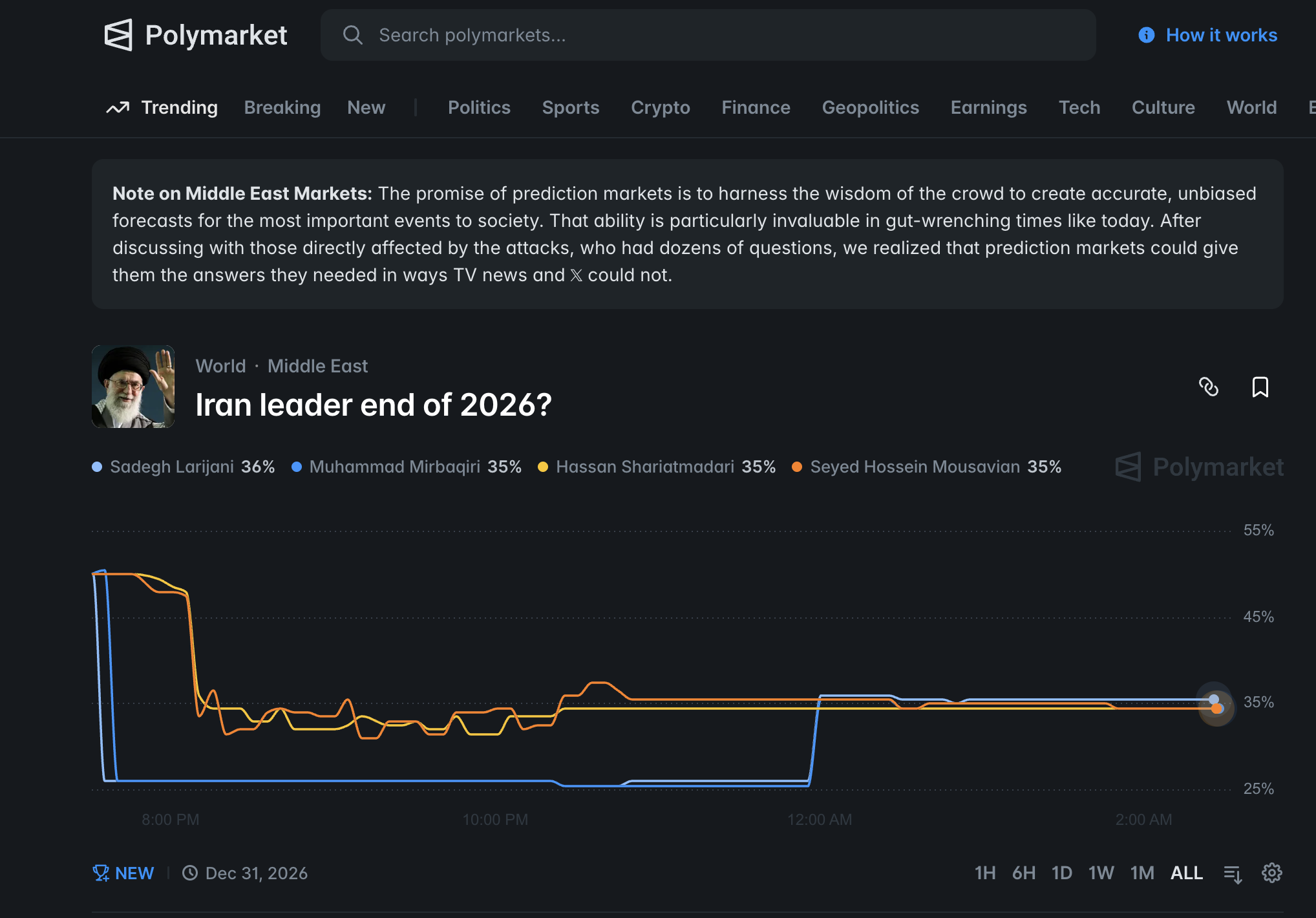 While prices were spiking, the company posted on X: “BREAKING: The odds Ali Khamenei is out as Supreme Leader have surged to 68%,” followed by: “Reminder: Kalshi does not offer markets that settle on death. If Ali Khamenei dies, the market will resolve based on the last traded price prior to confirmed reporting of death.” CEO Tarek Mansour reposted it.