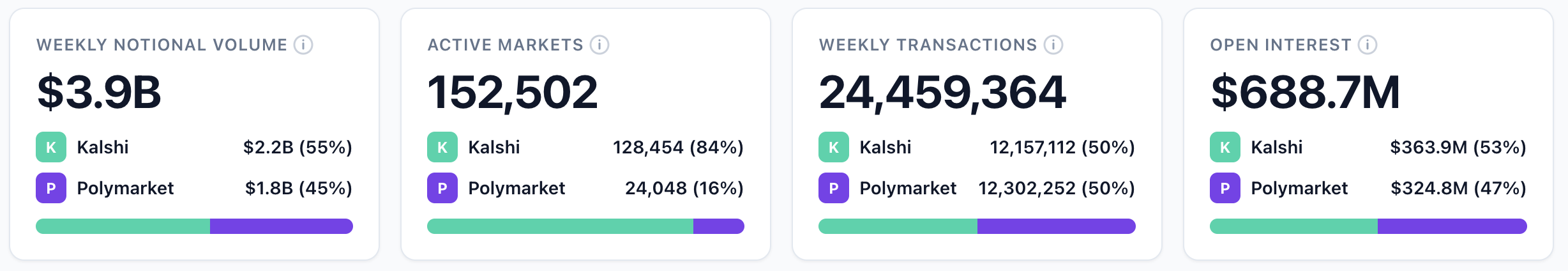 Interesting to note that Kalshi is riding a streak of 13 consecutive weeks of outperforming Polymarket on notional volume (since the week of Oct. 20), though a couple of those weeks the two were neck and neck. The last time Polymarket posted higher weekly volume was Oct. 13-19 when Polymarket had $1.06B to Kalshi’s $950.4M.