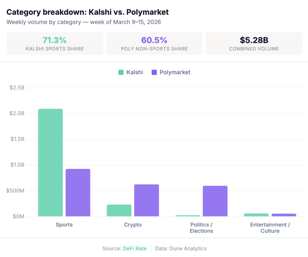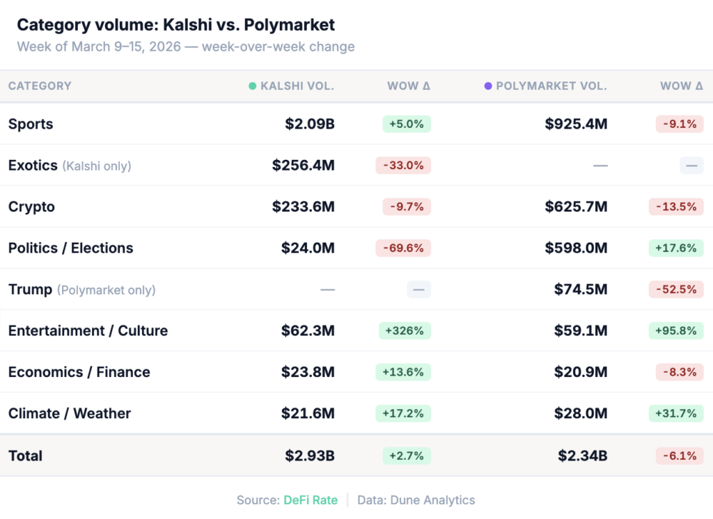 The weekly total dipped slightly, but the more telling story is Kalshi and Polymarket moved in opposite directions this week, driven by unrelated forces. Kalshi posted $2.93B in notional volume, its highest single-week total in the DeFi Rate tracking period, while Polymarket pulled back to $2.34B. Together they totaled $5.28B for the week of March 9–15, down modestly from $5.35B the prior week, as total industry volume across all tracked platforms hit $5.76B.