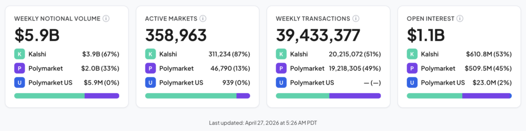 Weekly notional volume bounced back sharply after last week’s post-Masters pullback, with the two leading prediction markets combining for $5.9B in weekly notional volume for the week of April 20, according to DeFi Rate’s prediction markets volume tracker. Kalshi posted $3.91B, up 27.8% week over week from $3.06B, while Polymarket reached $1.96B, up ~4% WoW from $2.04B, a modest recovery compared to Kalshi’s surge.
