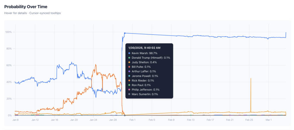 The decisive move came January 29. That evening, reports surfaced that Warsh had met with Trump at the White House. Warsh’s odds on Kalshi jumped from 31.2% to 81% overnight, and climbed to nearly 99% by the next morning. By the time President Trump announced the pick the following morning, the market had already called it. The official announcement via Truth Social January 30 was largely a formality for anyone watching the contracts.