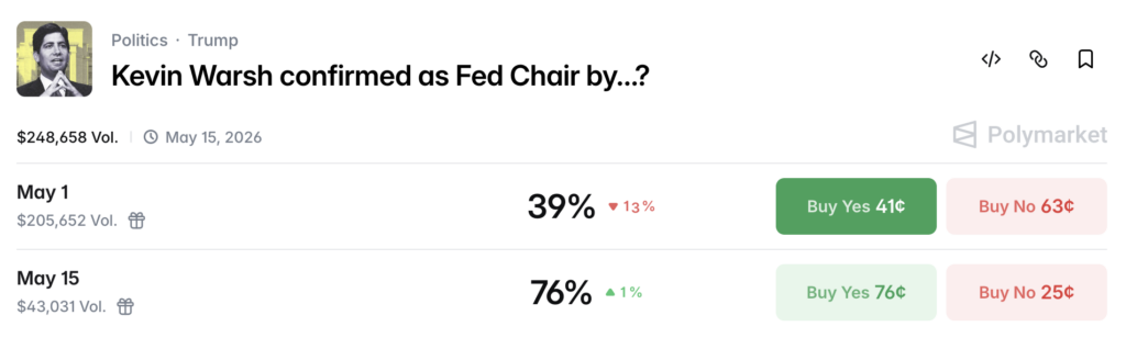Shelton had been on the original shortlist and retains genuine backing among hard-money conservatives in Trump’s orbit. Her late bump reflected a combination of factors: the gap between Trump’s January 30 announcement and today’s formal Senate submission, the confirmation complications introduced by Republican Senator Thom Tillis, and the basic willingness of prediction market traders to hold small positions on low-probability alternatives as long as the resolution event hasn’t occurred.