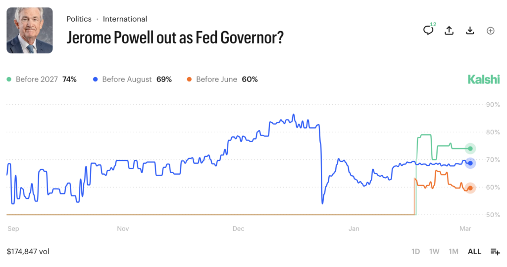 Powell adds another variable: his Board of Governors term runs through 2028, and he hasn’t said whether he’ll stay on as a governor once the chairmanship passes. Prediction markets are pricing in better than chance that he will leave the Board of Governors before his term runs out. That question carries real implications for the balance of power on the Board.