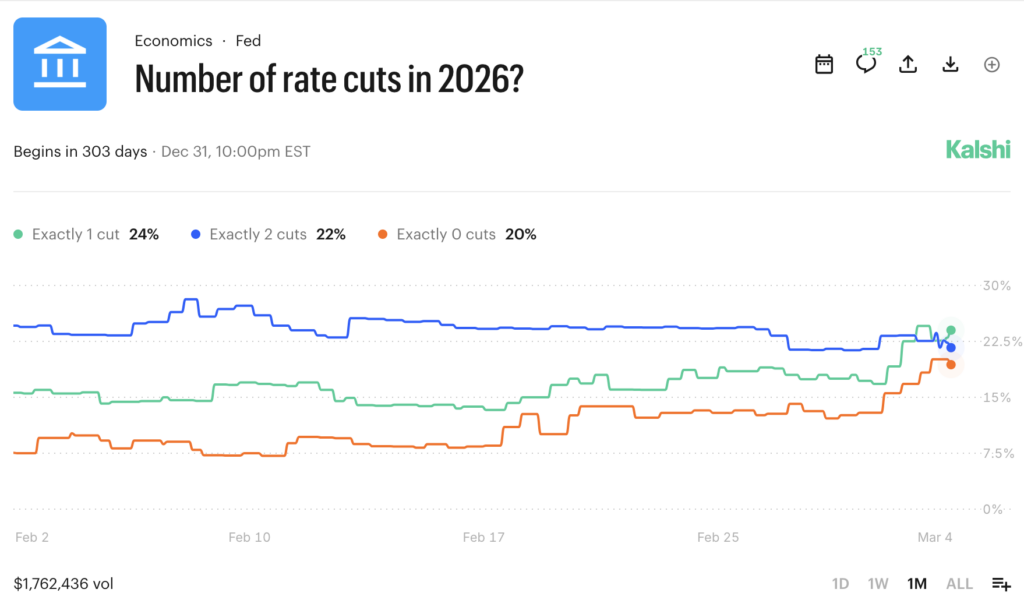 Prediction markets have reached 98% consensus there will be no fed rate cut in March. However, since Warsh’s official nomination today, Kalshi’s number of rate cuts in 2026 odds have shifted slightly. While “exactly 2 cuts” has led for most of the past month, with “exactly 3 cuts” briefly taking the lead, traders are now pricing in the real possibility of “exactly 1 cut” — the current leader at 24%. This market shows shifting expectations but even more so, it confirms current uncertainly.
