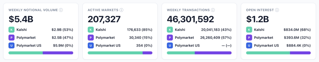 • Kalshi + Polymarket combined: $5.35B (+4.4% WoW)