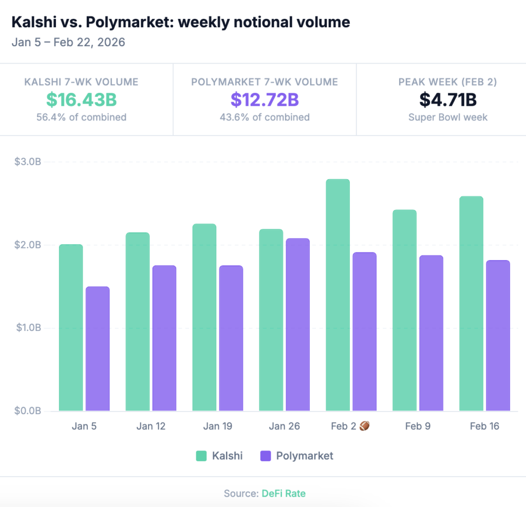 Kalshi’s $2.59 billion in weekly volume during the second week after the Super Bowl is not what you’d expect from a platform whose top volume driver just went dark. Kalshi was up 6.7% WoW, its second consecutive positive week, and crossed 49% market share for the first time in the current reporting period.