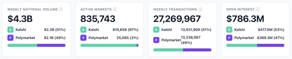 Open interest tells an interesting divergence story. Combined open interest across both platforms jumped to $786.3 million, with Kalshi at $417 million (53%) and Polymarket at $369.3 million (47%). But the trajectories this week went in opposite directions: Kalshi’s open interest ticked up modestly (+1.6%) while Polymarket’s dipped slightly (-1.7%) after last week’s 34.9% surge. But the overall trend remains upward for both.