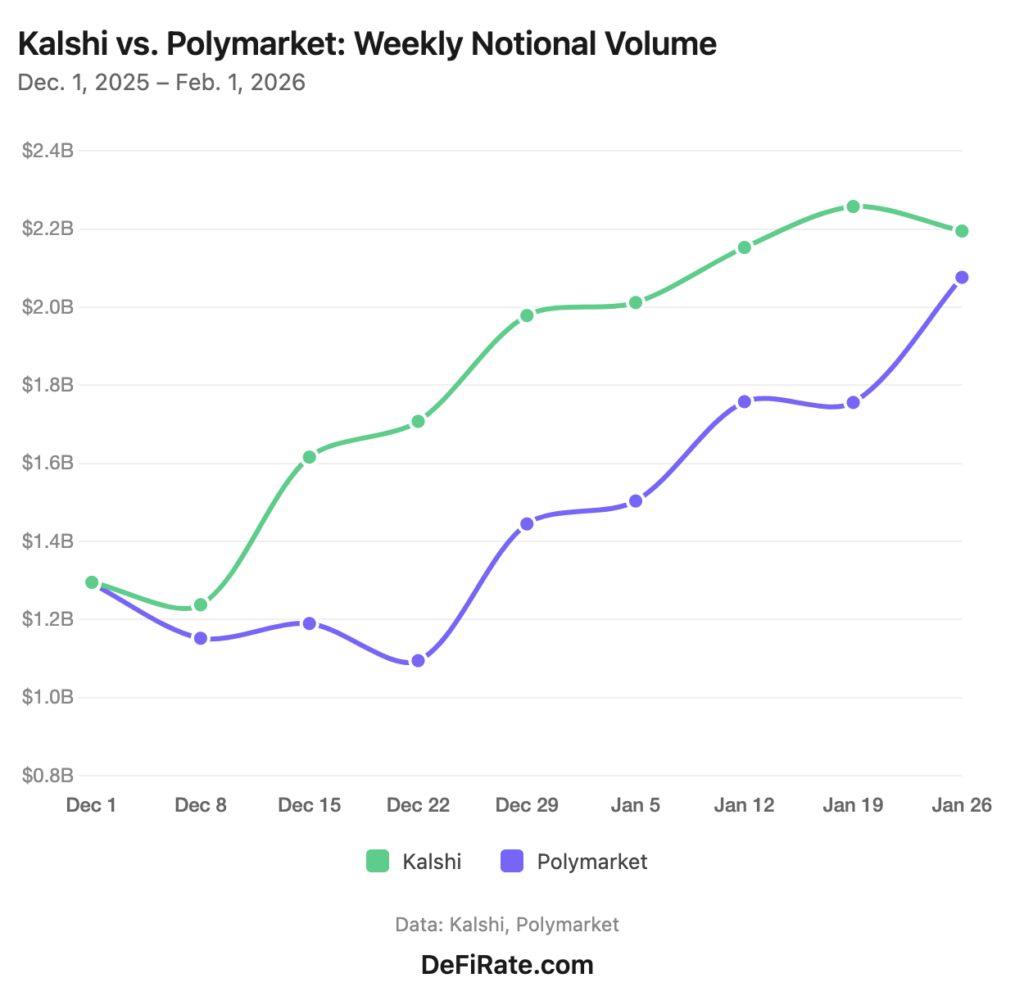 Kalshi vs. Polymarket key metrics compared (week of Jan. 26 – Feb. 1):