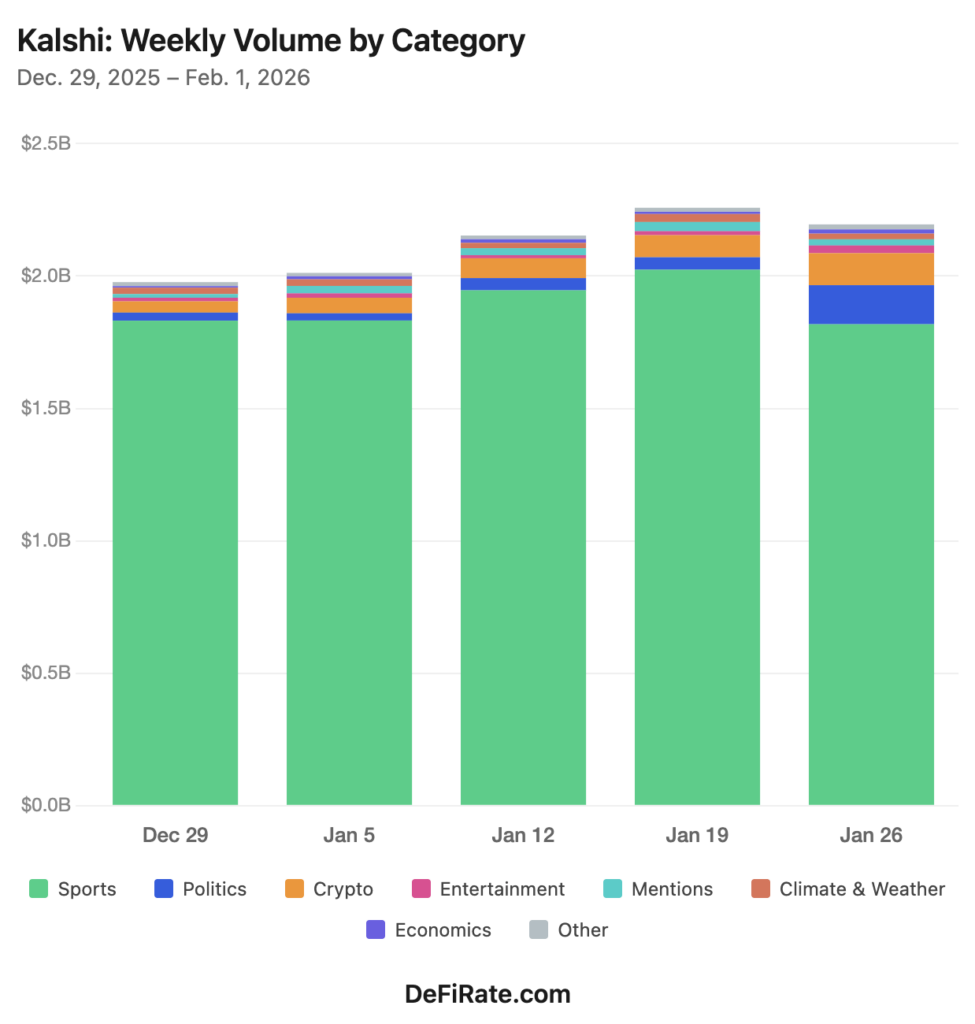 Crypto jumped 44.8% to $120.7 million, Entertainment nearly doubled (+92.8%), and Economics climbed 85.1%. Economics trading is spiking with activity around March fed decision probabilities as the Fed held rates steady in January, and President Trump announced his plan to nominate Kevin Warsh as the new Fed chair.