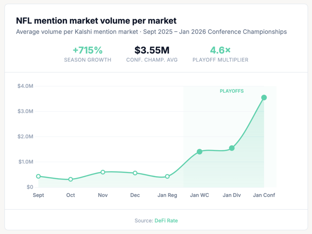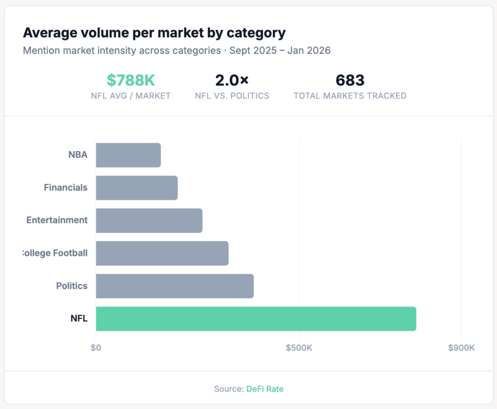 The growth of NFL mention markets this season is more than a novelty story. It represents one of the clearest use cases for event contract trading: a time-bounded, high-attention event with well-defined resolution criteria and a diverse range of probability outcomes. The fact that mention markets generated $788,000 in average volume per market — outpacing every other mentions category DeFi Rate tracks on a per-market basis — suggests they’ve found genuine product-market fit.