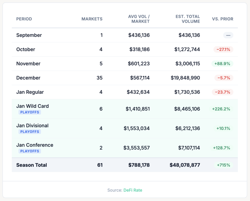 During the regular season, average volume per market held in a relatively tight band between $318,000 and $601,000. The markets were stable but still relatively niche. Then came the playoffs. Wild Card weekend averaged $1.41 million per market — a 3.3x jump from the regular season. By the Conference Championships, that number had reached $3.55 million, an 8.1x increase over the September opener and a 715% growth rate for the season.