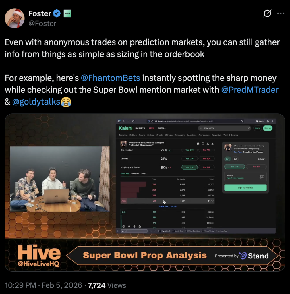 During a live stream on Hive analyzing Super Bowl props and mention markets, trader @FhantomBets identified imbalance in the order book as “sharp money” — a sign that someone with high conviction and significant capital was heavily positioned. And it was obvious what well-known mention market traders were behind the bids, even though individual trades on Kalshi are anonymous.