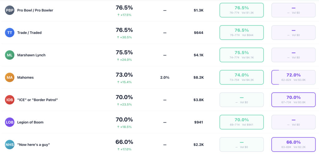 The near-certainties (Safety at 97.5%, MVP at 96.5%) and the long shots (Assault at 17%, Roughing the Passer at 20%) don’t offer much room for analysis. The contracts worth studying are in the 50–75% range, where the market is genuinely uncertain and specific knowledge about the broadcast, matchup, and announcer tendencies can create an informational edge.