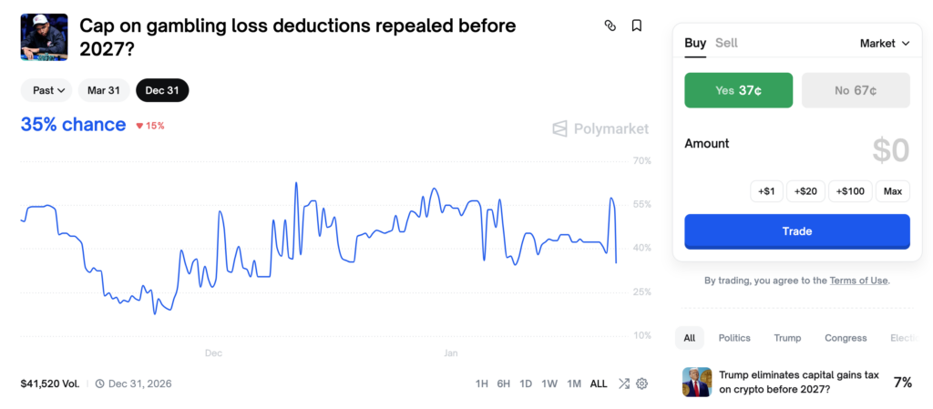 The markets can also serve a more practical purpose for gamblers and industry participants with real financial exposure to the policy outcome. Professional bettors, high-volume players, and gambling businesses all face uncertainty over how losses will be treated for tax purposes. By taking positions tied to repeal efforts, they can potentially offset some of the financial risk if Congress ultimately doesn’t move in favor of their interests.