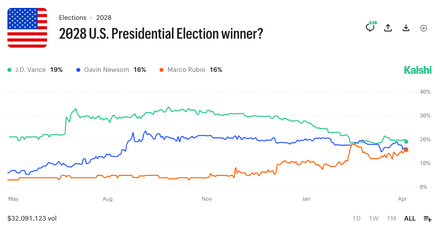 Prediction markets are pricing Vance and Rubio as the clear GOP leaders heading into 2028, not Trump himself. While Trump has teased a run at an unconstitutional third term, the markets are focusing on the succession structure.