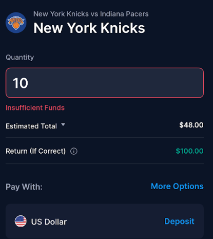 To trade on these events, you purchase a “Yes” or “No” contract based on what you think is going to happen. The pricing reflects the market consensus and serves as an indicator of the probability of the outcome, but not a guarantee. Contracts are set with a value of $10 or $100. As an example, consider these two NBA markets: