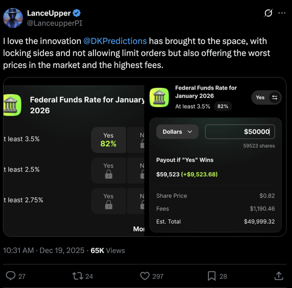 DraftKings’ fee structure is competitive with Kalshi for small positions but lacks the fee cap that makes Kalshi more economical for traders placing 100+ contract orders. The absence of disclosed exchange fees makes it difficult to calculate true all-in costs.