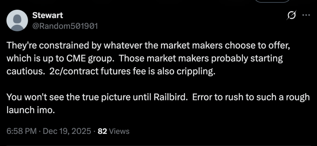 CME Group exchange fee amounts were not disclosed at launch. Traditional CME event contract fees typically range from $0.01 to $0.05 per contract depending on contract type and membership status, though these rates may differ for retail customers accessing through an Introducing Broker.