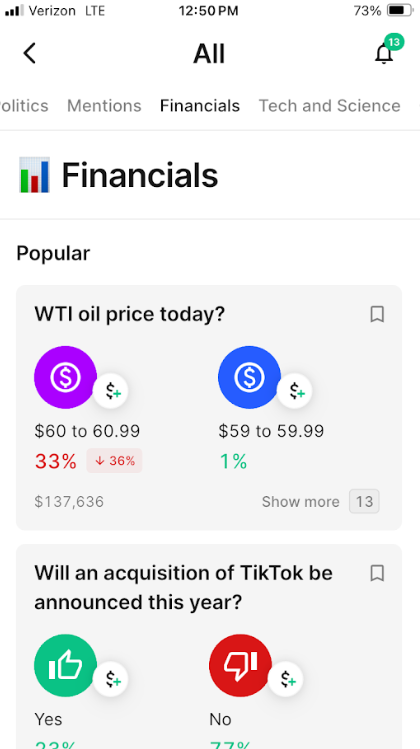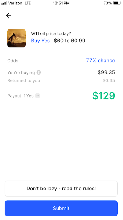 Many reviewers complimented the app for its smoothness and ease of use. On the complaint side, common gripes had to do with liquidity in select markets. In Kalshi’s defense, the platform can’t control what’s going to attract interest, and current volume for each market is clearly displayed.