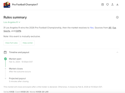 Take the “Pro Football Champion?” market as an example. The rules specify that if the Los Angeles Raiders wins the 2026 Pro Football Championship, the market resolves to Yes. Sources are listed as AP, Fox Sports, and ESPN. This means Kalshi uses these outlets to confirm the outcome on this particular contract, not the league itself.